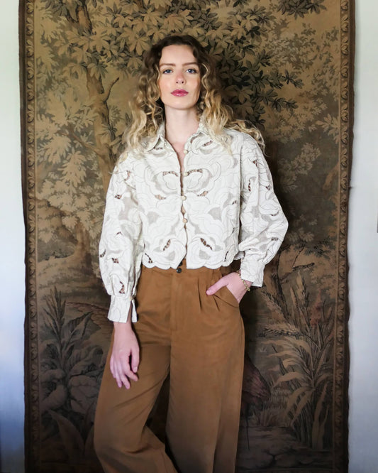 Hand Crocheted and Embroidered Cropped Shirt with Puff Sleeves
