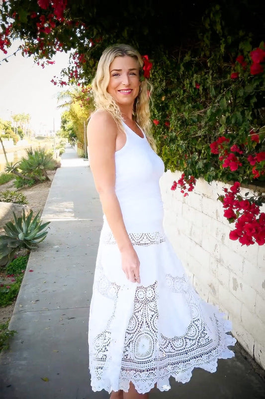 Flared Cotton Midi Length Patchwork Skirt with Hand Crochet and Embroidery