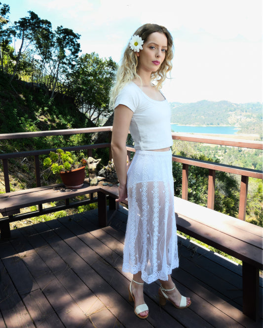 Hand Crocheted Sheer Midi Length Skirt with Vertical Stripes and Floral Motif Hem