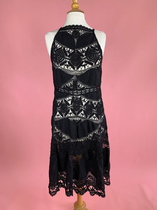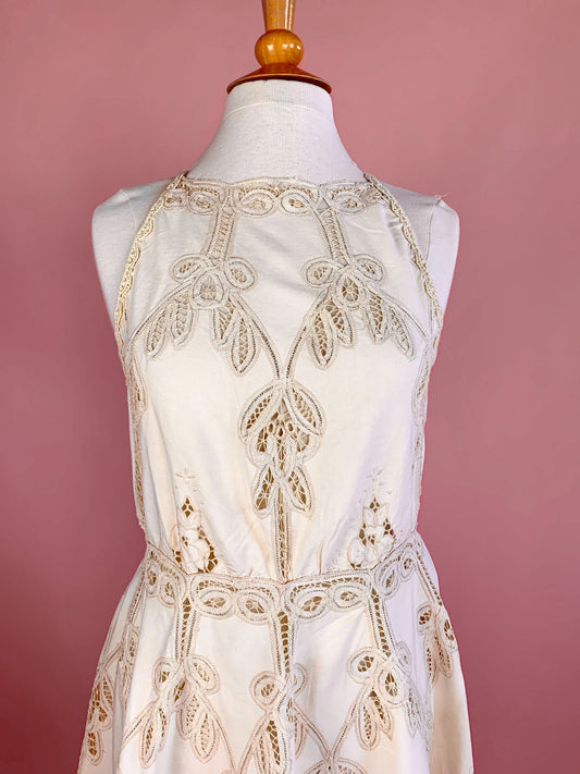 Vintage Battenberg Lace Midi Halter Dress with Flared Skirt