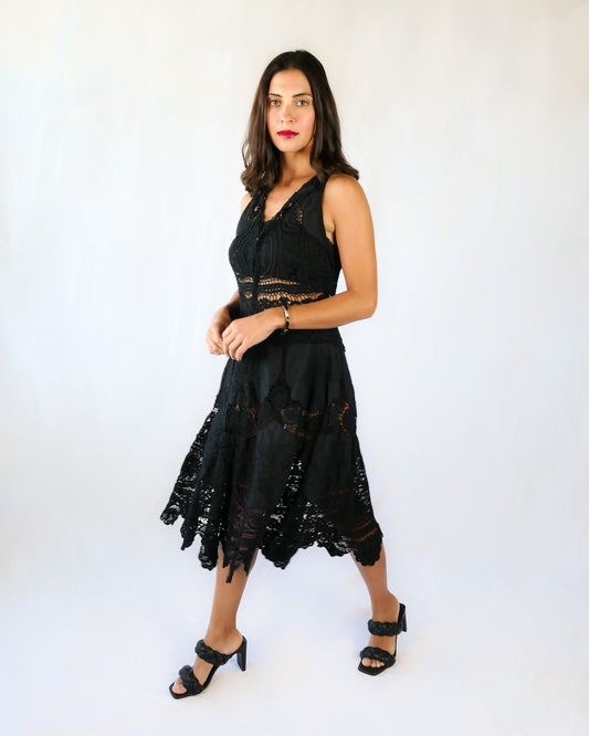 Crochet and Patchwork Embroidered Black Midi Flared Cocktail Dress