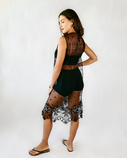 Sheer Crochet Coverup with Black and White Daisies at the Hem